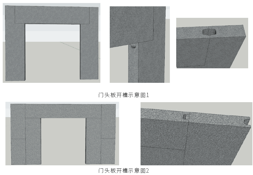 門(mén)頭橫板兩端搭接100~150mm,兩端豎板呈“L”型。首先進(jìn)行板材切割:門(mén)口豎板切割出“L”形,門(mén)口豎板上與門(mén)頭板連接橫縫、豎縫位置人工鑿出凹槽。門(mén)頭板安裝時(shí)凸頭向下,同時(shí)在其兩端人工鑿出凹槽。然后安裝:門(mén)頭板安裝時(shí)先將橫縫位置鋪滿(mǎn)砂漿,待門(mén)頭板與砂漿坐實(shí)后,將灌漿料灌入豎縫位置,保證灌漿料灌實(shí)。